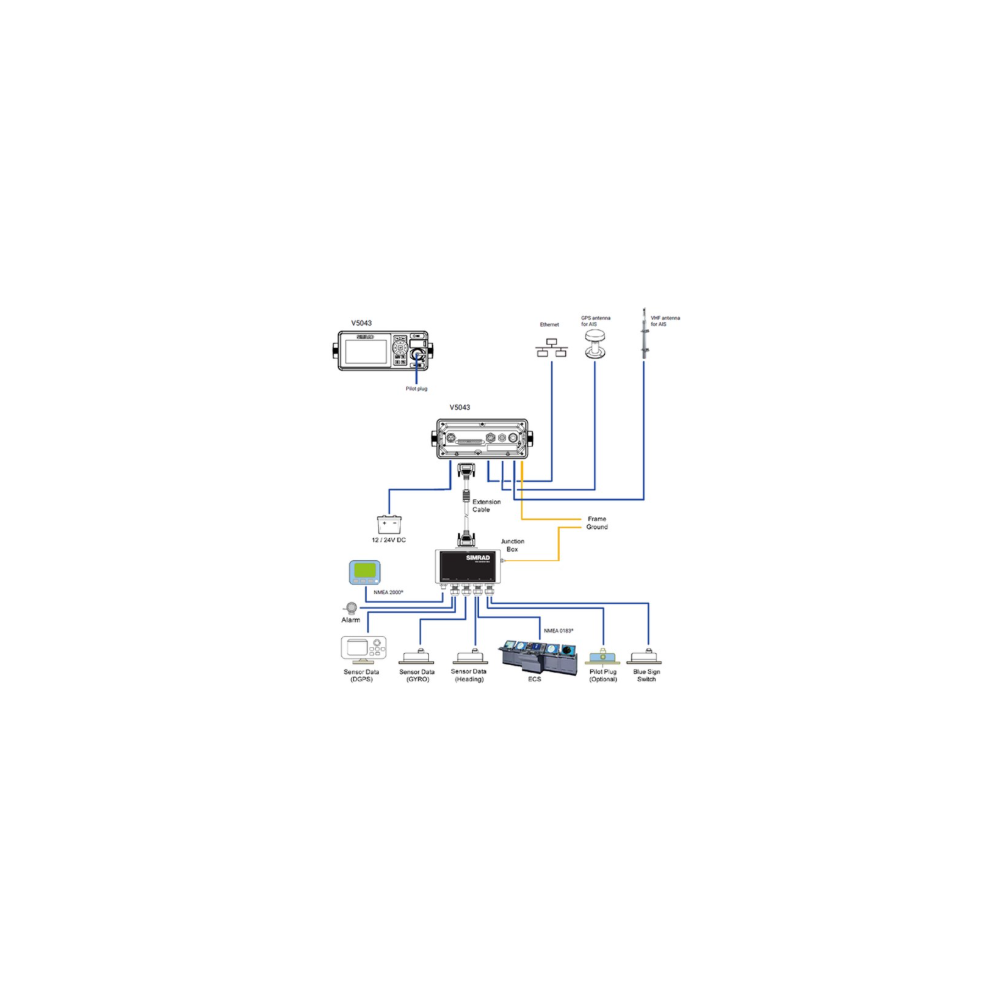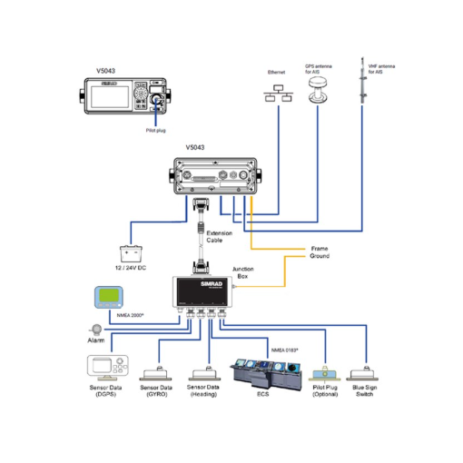 Le V5043 est livré avec une boîte de jonction fournissant trois ports NMEA 0183® bidirectionnels et un bus NMEA 2000® pour la connexion à plusieurs capteurs externes (par exemple, cap, gyroscope) et le partage des données AIS pour l'affichage par les systèmes de navigation tels que Simrad® GN70, MX610, ou MX612, et ECS/ECDIS, y compris la série Simrad® E5000.